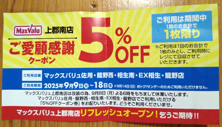 14:24 この左側の刈ってるように見えるのが上の段で、きのうやった所です。 右側に見えてる刈ったのか刈ってないのか分からない所が、今日やってたところです。 法面はまだ全く刈れてません。それと、この草の中に水のホースが通ってるので それを切らないように気を付けながらやってました。先に発見(発掘?)しておいて からやれば良いんですが、入って行けないし見えないし、、、刈りながら探し出します。 まあ、ここまでなる前にやっておけば良かったんですが、まあ、それが出来れば 苦労しないんですけどね~ 作業量、落ちてますからね~ ま、良いんですけどね。 そういうもんなんで逆らえません。 まあ、成り行きです。 出来る範囲でやってます。 次回も草刈りメインです!ガソリンが無くなったので忘れずに買ってから来ましょう! 今回はこんなところでした~ まだまだ暑いんで程々に頑張りましょう!!お得意です! ではまた~ (^o^)丿 PS.前回に上郡のマックスで5% 引き!!のクーポン券を貰ってました。 この何回か、 売り場の品物が減ってて空になってる棚も有ったりしたんですが、店を改装するようです。 ![]() それで、そういう事やったんか~と納得して、「9日から18日やったら次来る時に使える やん!」 と思って大事に持ってました。改装後のリフレッシュオープンの割引きなんやろう と思ってました。(よく見れば8日に改装のため閉店して、9日からリフレッシュオープン とかおかし過ぎるんだけど、そう思ってました。)それでマックスに着いてみたら、駐車場の 入り口が塞がってて、1カ所だけ開いてました。それで入ってみたら、オープンセール やってるのに車があまり入ってません。トラックが多いです!しかも!!店の入り口は 閉まってました!!???「 いったいどういう事や!?」 という事で、クーポンを良く 見てみると、上郡店は8日から改装のために閉まって、ちょっと遠くなるけども別の 店で買い物してください。その時はこれ使ってくださいね。というクーポン券でした。。 (-"-) せっかく使えると思って無くさないように大事に持ってたんですが、、、よく読んでませんでした。 まあ、読んではいたんですが、自分好みに読んでました。拾い読みの一種ですが、ま、 都合よく自分好みに拾ってしまってました。。。 これは僕以外にも大勢おってやろうと思って、 駐車場見まわしてみたんですが、工事関係以外の車は1台も止まってなくて、クーポン券 見つめながら途方に暮れてる人も一人もいてませんでした。。。 たぶん、少し前にはようけいてやったと思いますよ。 もう昼回ってましたからね。(^▽^;) で、ボンマルシェで買い物をしました。そしたら、コストコの商品を並べてたので、 「転売ヤー?? こんな大っぴろげに!!??」 と思ったら、なんか提携の販売 と書いてありました。まあ、そんなんで、買い物難民にはならなくて済みました。 しばらくどこで買い物しましょうか?まあ、来るまでにはなんぼでも店有りますけどね(^▽^;) |