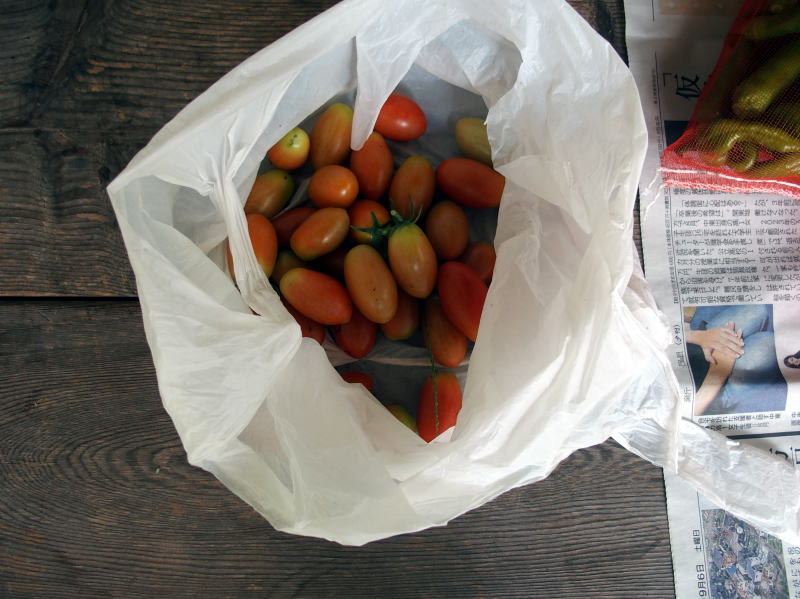 10:05 朝からブルーベリーと野菜の収穫をしていました。 ブルーベリーは 土曜の半分くらいでした。写真撮ってませんでした。ミニトマト(アイコ)も 木自体が傷んできて実も減ってきています。来年の課題ですね~ 上手に仕立ててたら傷みにくいと思います。今は草と絡んでしまってて 収穫する時とかにどうしても幹や枝を傷めてしまいます。来年は広目の 所で手入れしやすいように仕立ててみます。やり方考えるのも楽しみですね。 |
