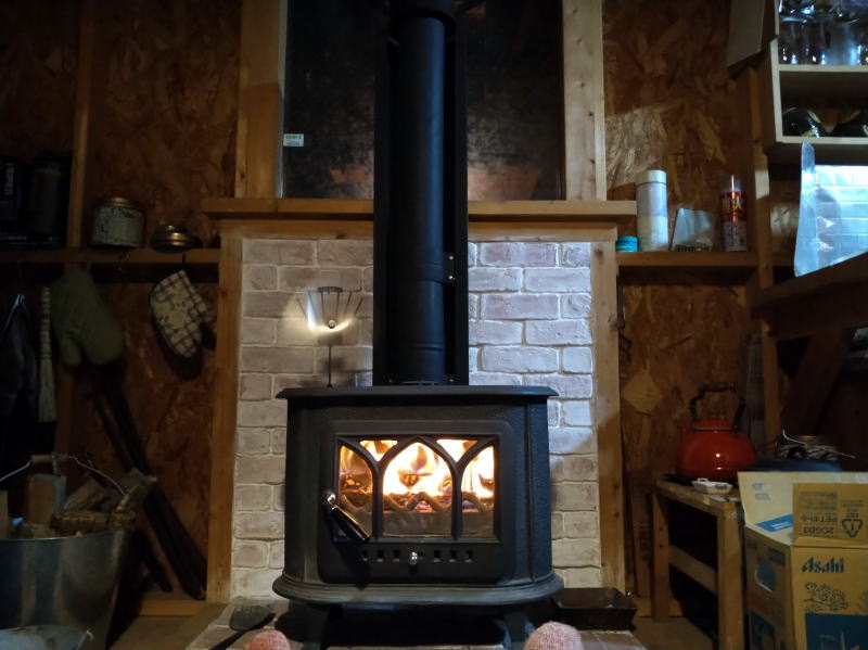 | 19:15 風呂から上がって、薪ストーブに当たってます! ほんま気持ち良いですよ~~ 薪ストーブのシーズンですね! (*^^*) |