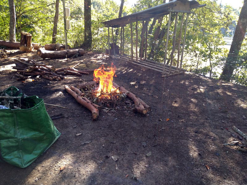 | 9:30 雨も止んだんで、乾いてるのをぶち込んで燃やしてみました! そしたらまあ、乾いてるのは値打ちありますね~ 良く燃えてます! |