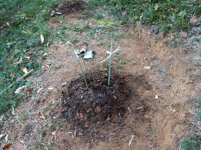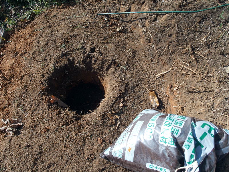| 14:00 やることは前回と同じです。穴の底に堆肥を1袋分入れて、その 上にピートモスをこの袋の半分を入れます。それから水をいっぱいかけて 棒で良~~く突いてピートモスを水に馴染ませました。マスクしてです。 |