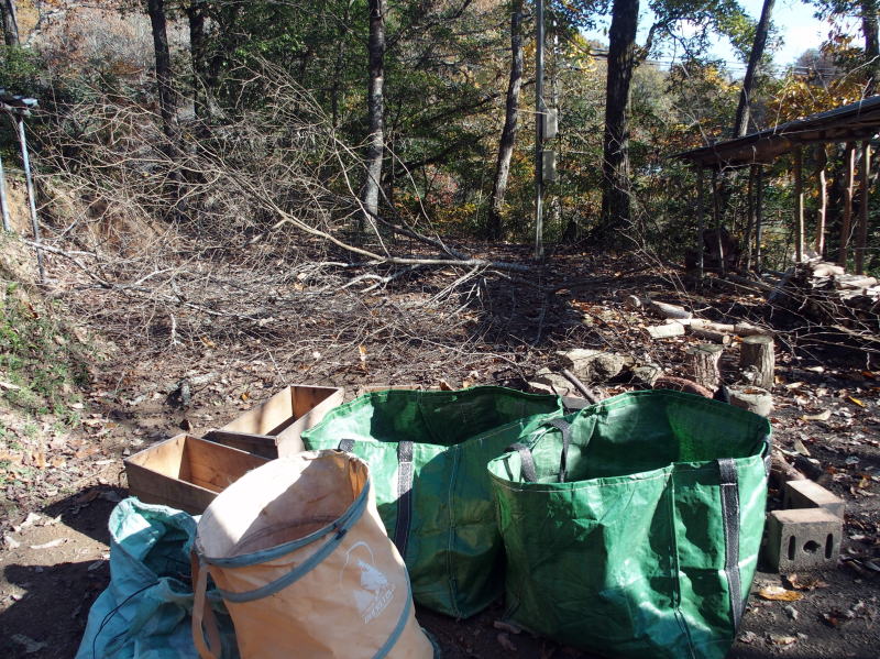 | 13:31 今回も金曜から月曜の3泊4日です。金曜日(今日)は午後1時前に 山に着きました。天気は良いんで、昼ご飯を食べてからすぐに、前回に切って 落としてた桜の枝を風呂の焚きもん用にバッグに貯めておくことにしました。 |