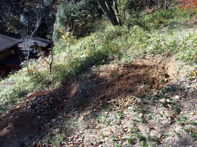 12:15 斜面なんで、植えれるように段を作っています。 笹の根がすごいんですが、感じが出てきました。 もうひと頑張りなんですが、昼からにしましょう!けっこうきついんです。(^▽^;) |