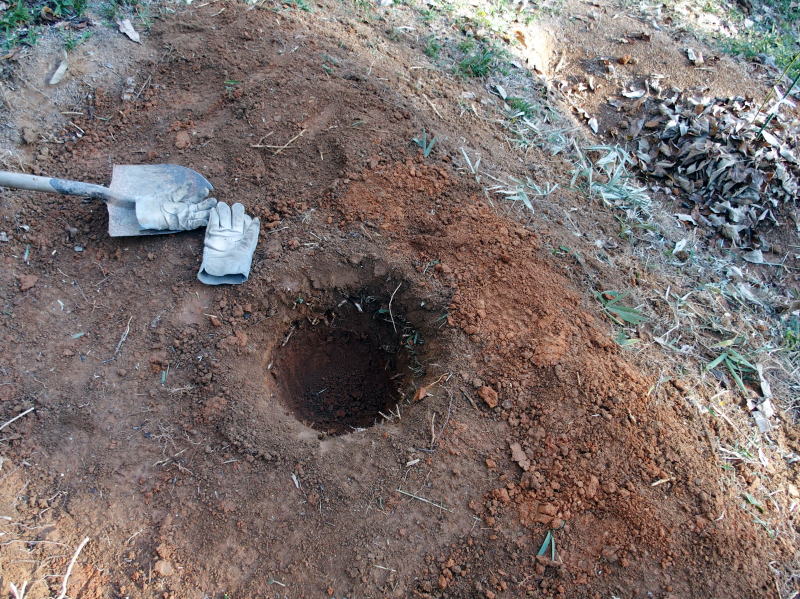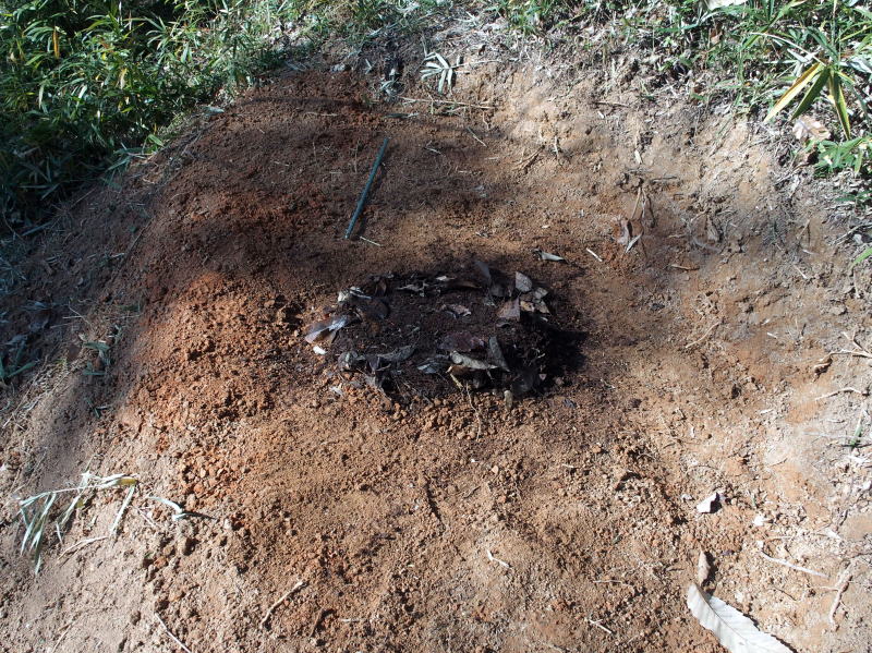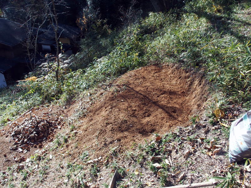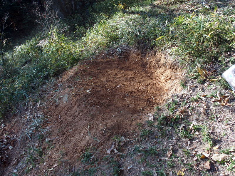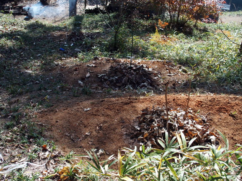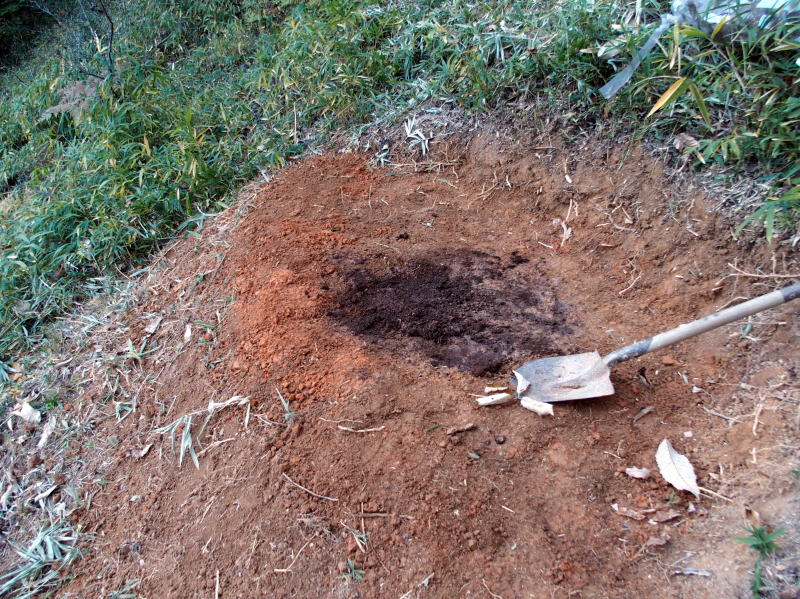 | 15:00 穴を深さ50cm くらい掘れました。ここに堆肥を一袋分入れました。 前回と同じです。 |