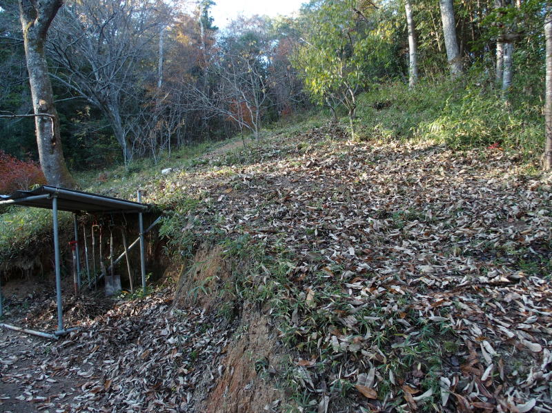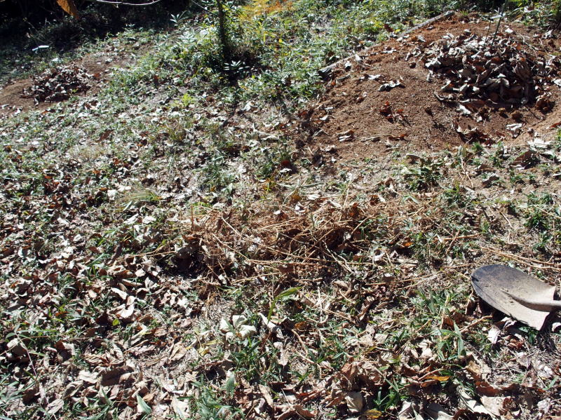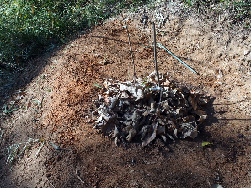 | 12:22 枯葉でマルチをしておきました。この写真ではブルーベリーは ほとんど気づきませんね~ まあ、支え棒が見えてるんで良いんですけどね。 |