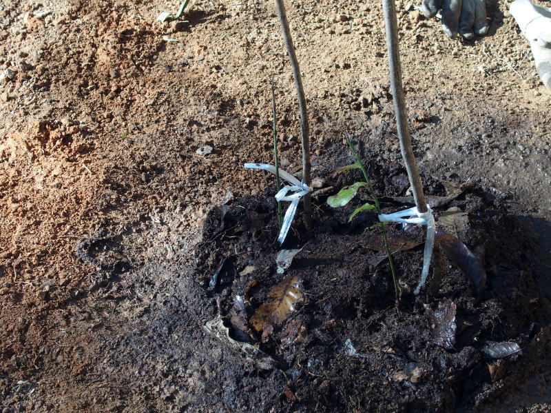 | 12:18 目を付けていた4号のサッカーを2本植えました。 立派なのは支え棒(杜仲の枝です。)で、ブルーベリーは横の細いのです。(^▽^;) |