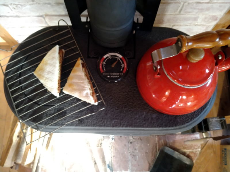 | 8:19 中は薪ストーブでポッカポカです! ぎりぎりまで焚いてますね!(^▽^;) ストーブトップではカツサンドが良い色になってきてます!これが美味しいんです!(*^^*) |
