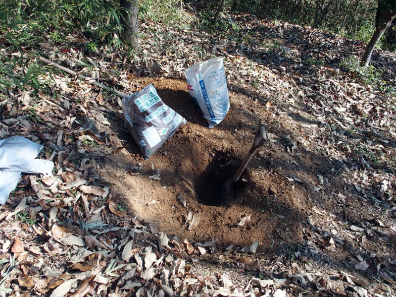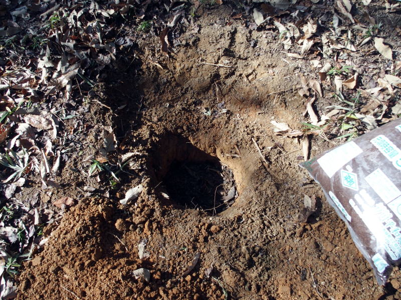 | 13:12 前回にブルーベリーを植えれるやん~と思った堆肥予備置き場の上辺りの 斜面に穴を掘って堆肥を入れるところまで出来ました。やってる事は前回とかと同じです。 この後、ピートモスを半分入れて水をたっぷりかけて棒で突いて馴染ませました。 これも前回とかにやったのと同じです。同じ作業が続いてます。(^▽^;) |