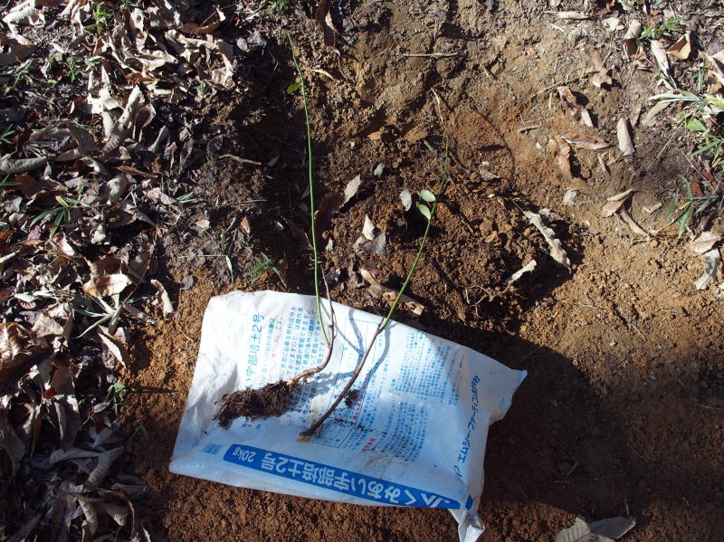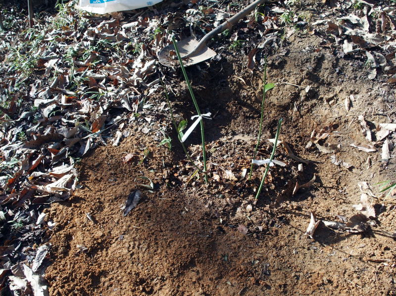 | 12:24 同じ作業なんで途中は割愛して、4号のサッカーを2本植えました。 支え棒は木の枝(枯れ枝)です。 |