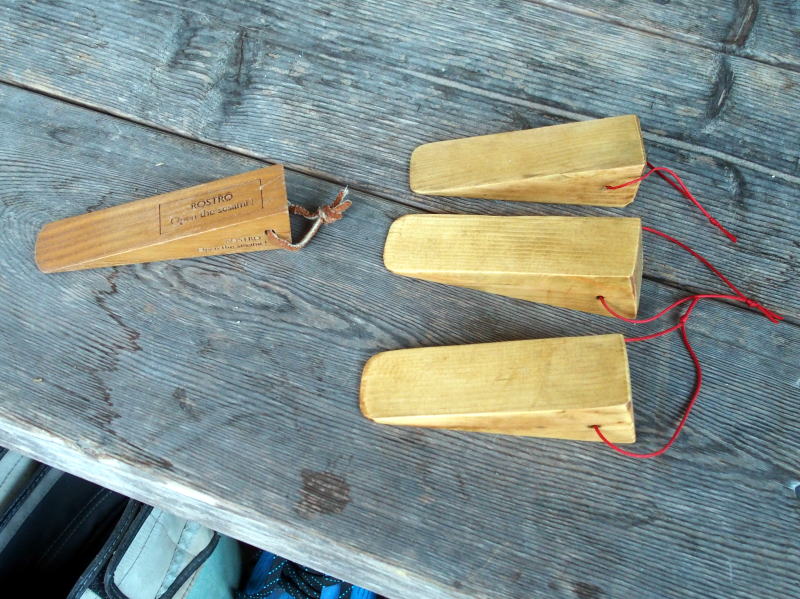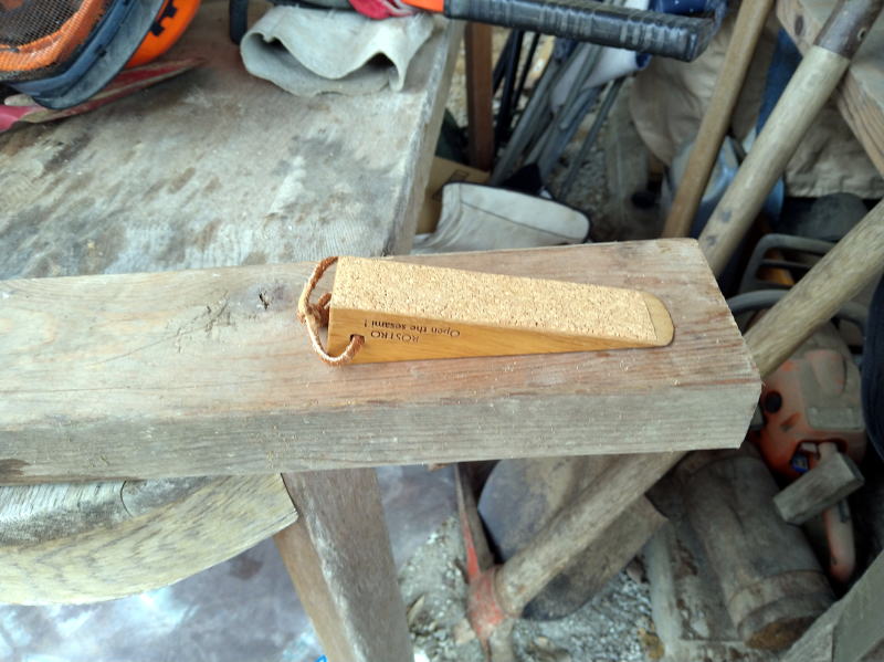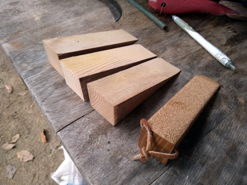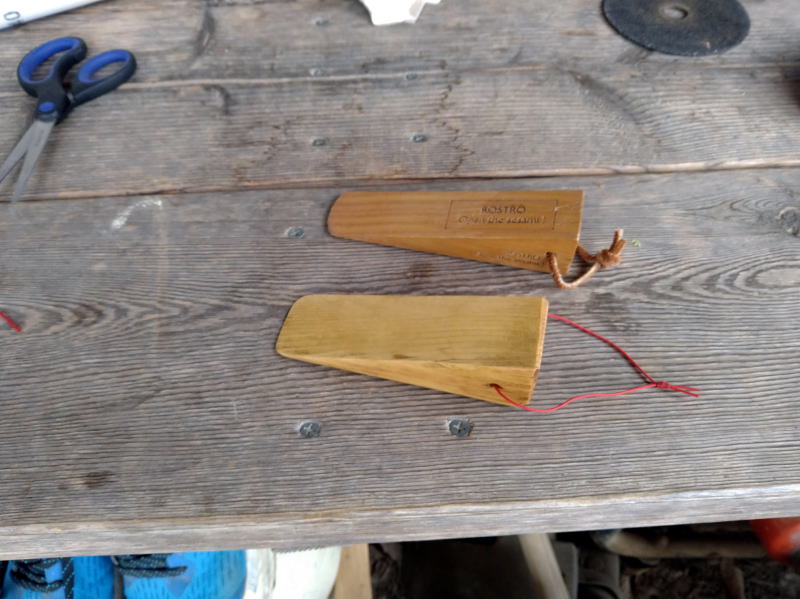 | 11:13 奥さんからドアストッパーを作ってくれたら有り難いと言われたので、 勿論作らせていただきますよ~!(*^^*) これは家から持ってきた見本です。 材料は良く乾いてて木目が通ってるのが良いと思って床下を探したら、丁度 良い感じのツーバイの端材がありました。見本の下になってるのです。 |