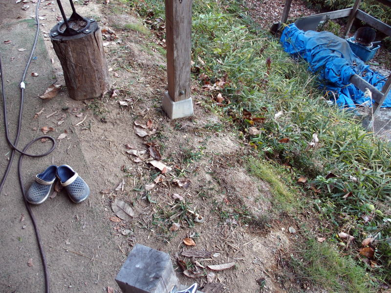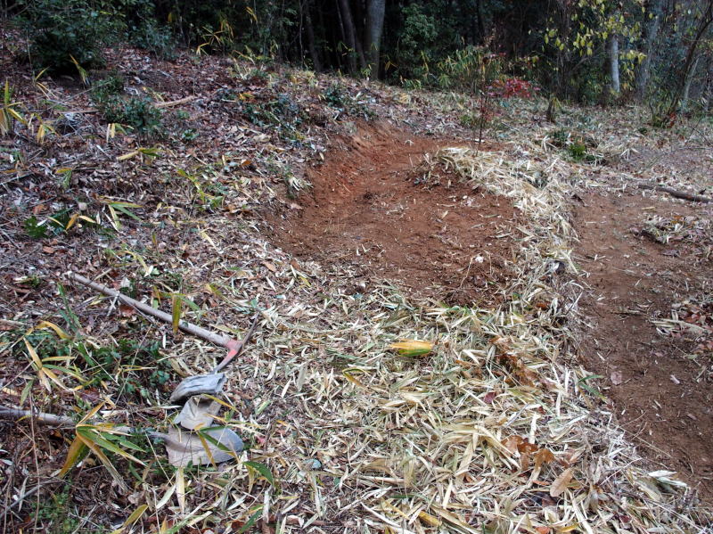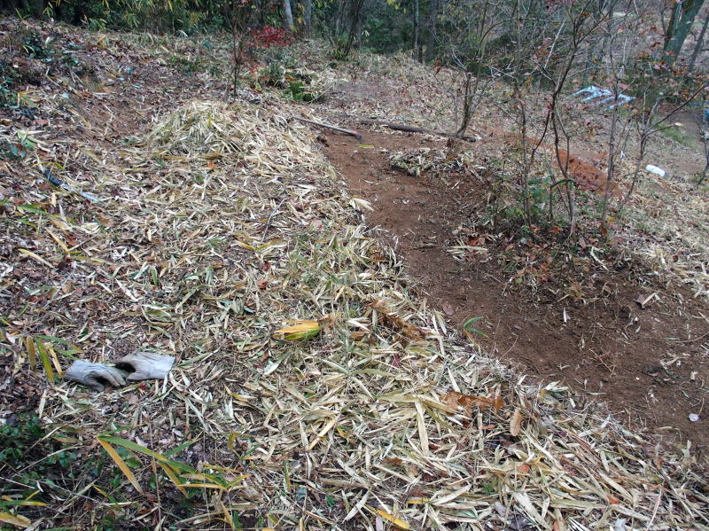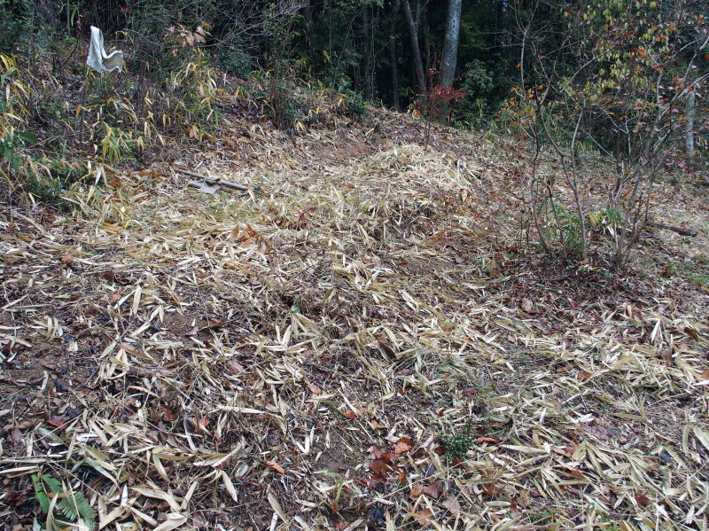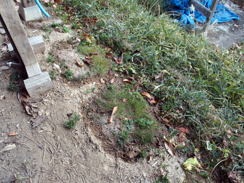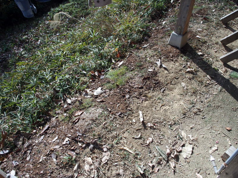 | 12:47 4日目。帰る日です。初日に芝の周りの笹や草を刈りましたが、 周りの土と段差になってる所があって、広がるのの妨げになってるようでした。 それで、堆肥予備の所の底にできてる腐葉土を補充しておきました。 |