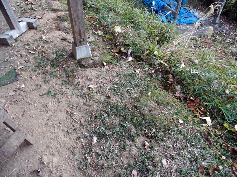 | 14:53 今年の6月の1回目に植えた芝生です。枯れたりはしていないんですが、 下からは笹が貫通して出てくるは、周りからはいろんな草に攻められるは、で 困ってる感じだったんで、植えたもんの責任として手を入れてやることにしました。 (いつも水はやってますけどね) |