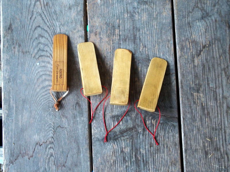 | 12:42 ディスクグラインダーにサンドペーパーを付けて磨いて、あと 手でサンドペーパーかけてから塗装しました。塗料は風呂棟の土台や 柱に塗ったのと同じメープルです。塗ってすぐにボロ切れで拭き取って 見本と同じような感じにしました。ドリルで穴を開けて紐を通して 1個完成しました。上手く出来たと思います。あと2個作れるんですが、 昼からにしましょう。裏にコルク板を貼るのは奥さんがやってくれます。 |