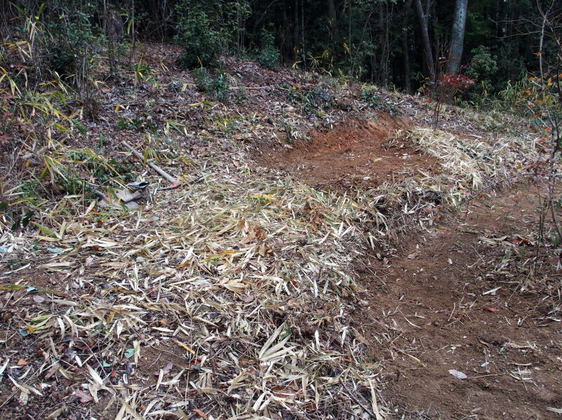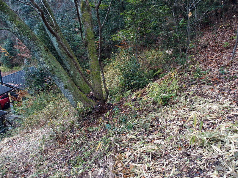 | 12:15 この地面に着手する前に、後ろに迫ってる植生をカットしました。 ミツバツツジも有るんですが、カットした後ろにも控えてるんで大丈夫です。 株まで抜きはしなかったんですが、また様子を見ておけば良いと思います。 |