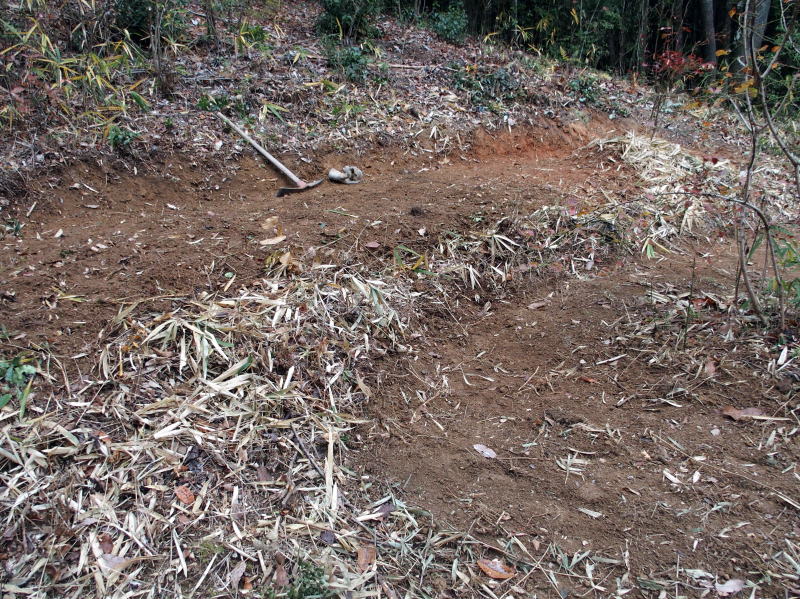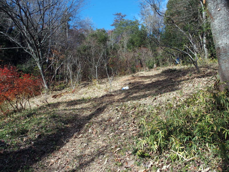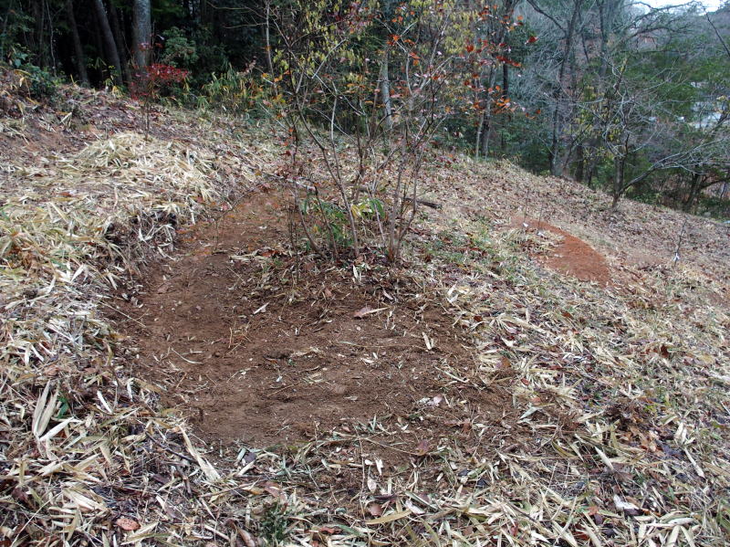| 11:27 この右側のは6号と7号で、その一段上に紅葉しているのが 8号です。ここをもう少ししっかり段を作って、8号のこっち側に もう1本、4号のサッカーを掘ってきて植えようと思います。 |