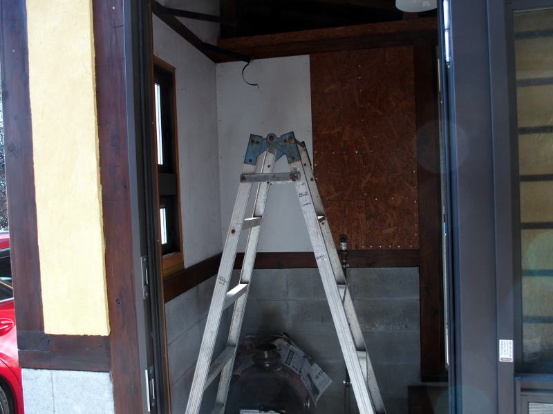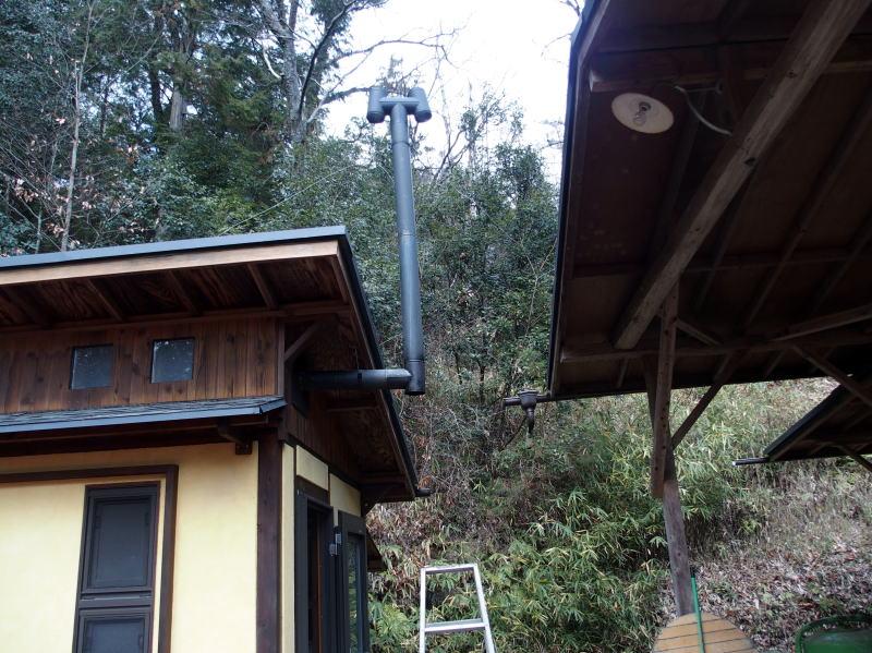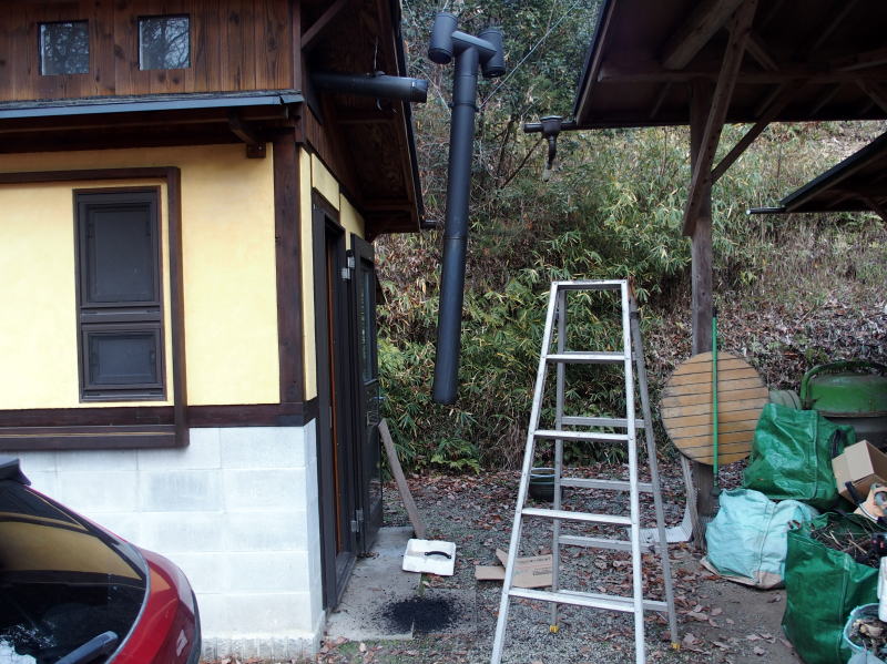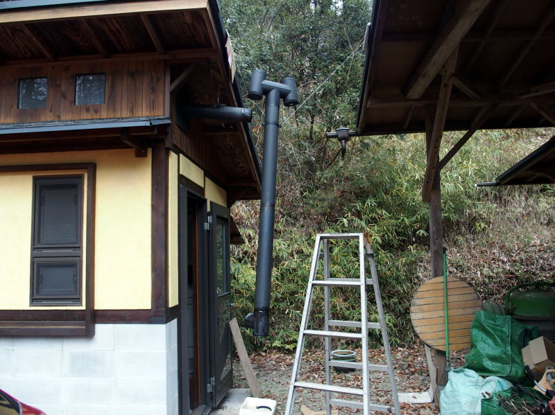 12:02 まあ2時間見てたら終了できるんですが、雲が広がると寒くなるんで、 良い天気の内にやってしまいましょう! 風呂釜の煙突掃除です!! いつものようにワイヤーが当たるところに段ボールと新聞紙で養生しておきます。 (この外部の縦の部分が90°回ってて、前は往生したんです。この向きは間違いです。) |