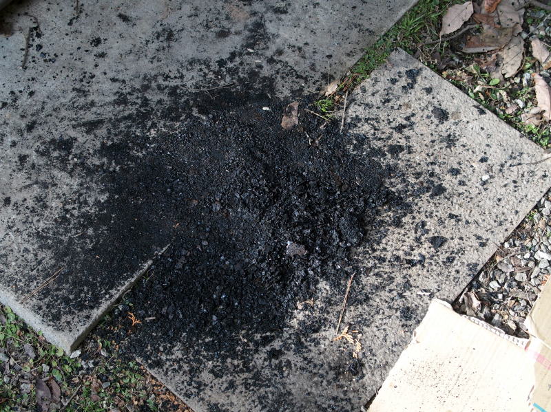 | 12:35 外れました!まだブラシで擦ったりしてないんですが、煤がドサッと落ちました。 この煤なんですが、ストーブの方ではなった事が無い硬いギラギラした煤で タールみたいなやつです。木酢液の匂いがしますしね~ ま、煙突が一重なのと、焚きもんの水分が多いせいという事だと思います。(^▽^;) |