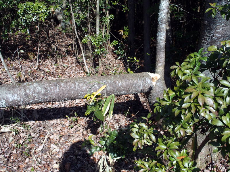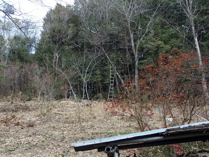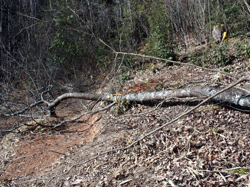 | 11:55 前回に言ってたように、この山桜の幹を伐ります。斜めになってる方です。 上の方が結構こっち向きに出ていますね~ (^▽^;) |