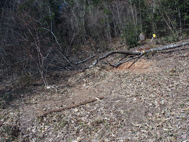 | 12:41 倒れるときにワイヤーがたるむんで、思ってた方向まで誘導できませんでした。 上の方が大分下側に振ってたんでチルで引いてたんですが。。。 先の辺がブルーベリー(8号)の上に落ちてます~ (^▽^;) |