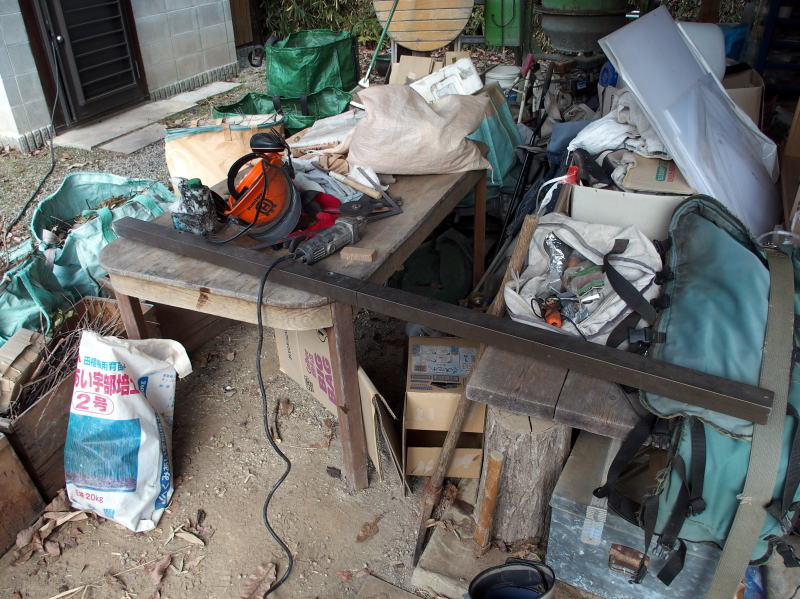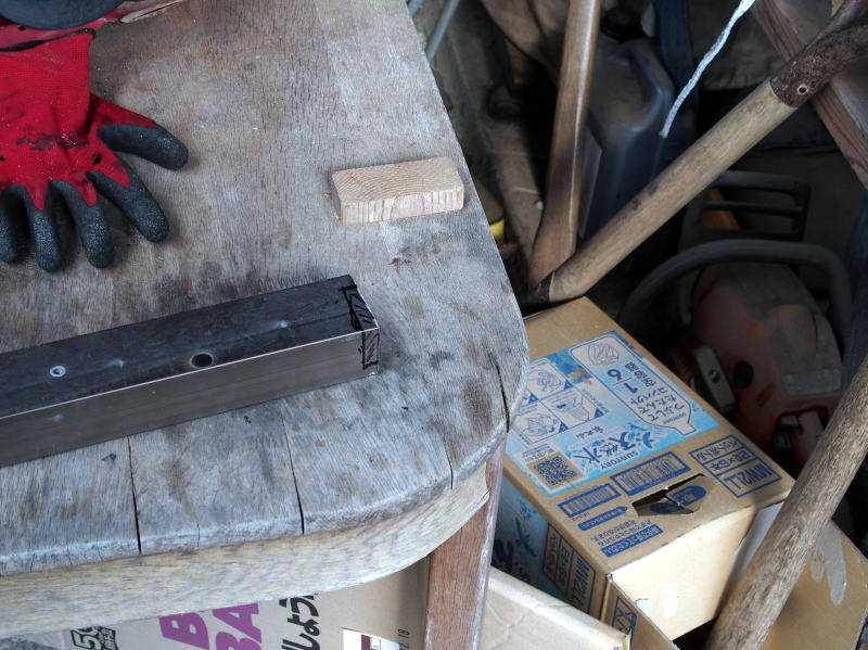 | 11:50 ちょ、ちょっと雑然としていますが、(^▽^;) まあ、作業は出来ますんで! この茶色いアルミの角もんが長いの1本と短めのが2本有るんで、それで作ります。 |